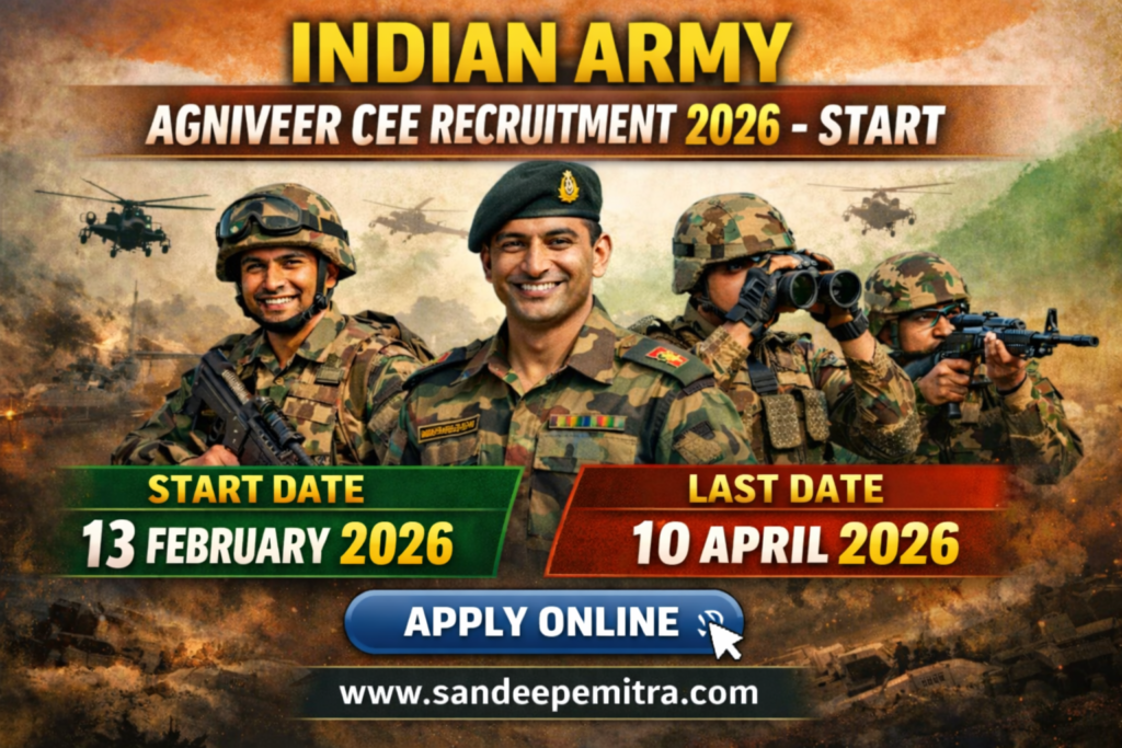 Join Indian Army (Bhartiya Sena),Indian Army Agniveer CEE Recruitment 2026 Indian Army ne apni official website par Common Entrance Exam (CEE) Agnipath Agniveer Recruitment 2026 ke liye notification release kar diya hai. Is bharti ke liye online application form 13 February 2026 se start ho chuka hai aur candidates 10 April 2026 tak apply kar sakte hain. Is recruitment ke liye minimum age 17.5 saal rakhi gayi hai, jabki maximum age 21 se 34 saal tak (post wise) 01 July 2026 ke hisaab se hogi. Sabhi candidates ko salah di jati hai ki apply karne se pehle Indian Army Agniveer CEE Recruitment 2026 ki poori details dhyan se check kar lein, jo niche di gayi hai.
