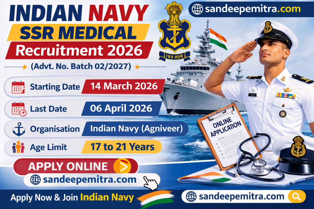 Indian Navy SSR Medical Recruitment 2026,Join Indian Navy (Agniveer) ne Sailor Entry SSR Medical post ke liye official website par recruitment notification release kar diya hai. Is bharti ke liye online application form 14 March 2026 se start hoga aur candidates 06 April 2026tak apply kar sakte hain. Is recruitment ke liye minimum age 17 years aur maximum age 21 years rakhi gayi hai. Jo candidates is bharti ke liye apply karna chahte hain, unhe Indian Navy SSR Medical Recruitment 2026 se judi sabhi important details niche di gayi information me dhyan se check kar leni chahiye. (Advt. No. Batch 02/2027).