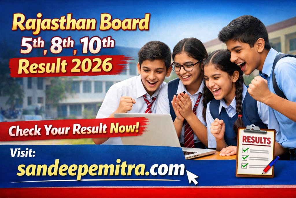 Rajasthan Board 5th, 8th,10th Result 2026,राजस्थान माध्यमिक शिक्षा बोर्ड (RBSE) ने Rajasthan Board Class 5th, 8th और 10th Examination 2026 का रिज़ल्ट अपनी official website पर जारी कर दिया है। यह परीक्षाएँ 19 February 2026 से 04 March 2026 के बीच आयोजित की गई थीं। जिन छात्रों ने इस परीक्षा में भाग लिया था, वे अब अपना Result ऑनलाइन चेक कर सकते हैं। रिज़ल्ट देखने के लिए छात्रों को पोर्टल पर जाकर अपना Exam Roll Number और Captcha Code दर्ज करना होगा। छात्रों की सुविधा के लिए Rajasthan Board Class 5th, 8th, 10th Result 2026 चेक करने का direct link नीचे दिया गया है।
