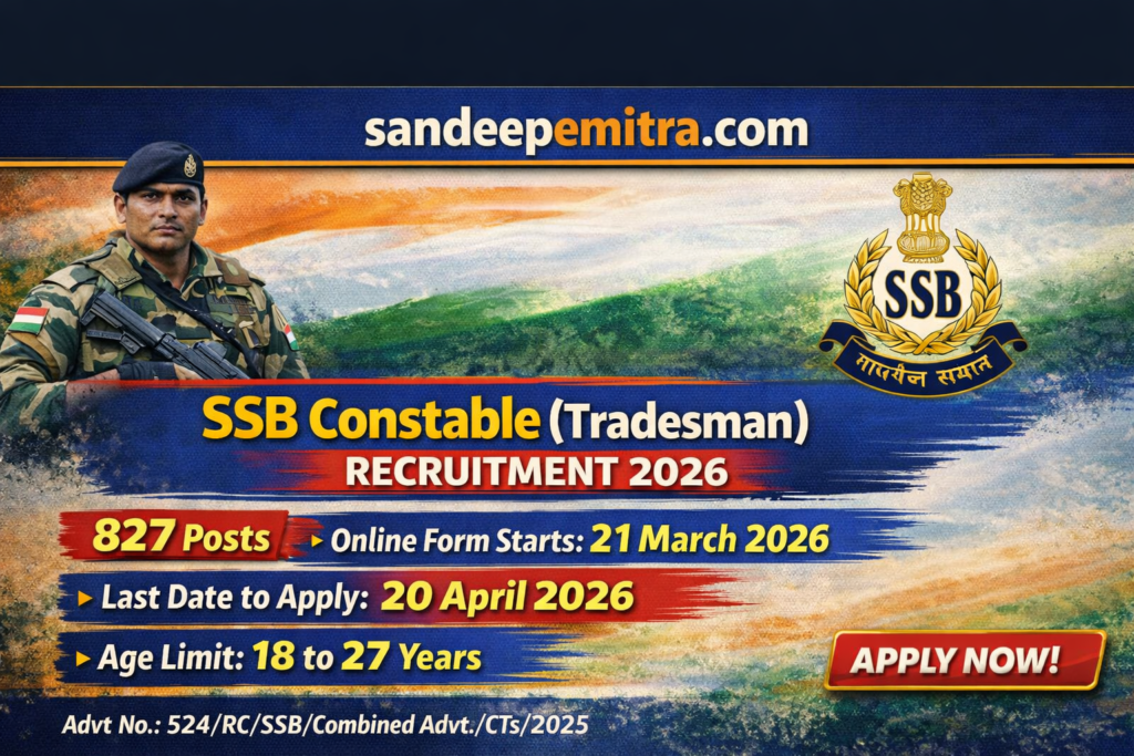 SSB Constable Tradesman Recruitment 2026,Sashastra Seema Bal (SSB) ने अपनी Official Website पर Constable (Tradesman) Recruitment 2026 के लिए नई भर्ती का नोटिफिकेशन जारी कर दिया है। इस भर्ती के माध्यम से कुल 827 पदों पर नियुक्ति की जाएगी। SSB Constable Tradesman Application Form भरने की प्रक्रिया 21 March 2026 से शुरू हो चुकी है और इच्छुक उम्मीदवार 20 April 2026 तक ऑनलाइन आवेदन कर सकते हैं। इस भर्ती के लिए उम्मीदवारों की न्यूनतम आयु 18 वर्ष होनी चाहिए, जबकि अधिकतम आयु 23 से 27 वर्ष (Post Wise) निर्धारित की गई है। आवेदन करने से पहले उम्मीदवारों को सलाह दी जाती है कि वे SSB Constable Tradesman Recruitment 2026 से जुड़ी सभी महत्वपूर्ण जानकारी ध्यान से पढ़ लें। अधिक जानकारी और Apply Link नीचे उपलब्ध कराए गए हैं।