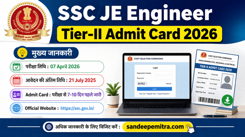 SSC JE Engineer Tier-II Admit Card 2026,Staff Selection Commission (SSC) ने Junior Engineer (JE) Examination 2026 के लिए Tier-II Admit Card अपनी official website पर जारी कर दिया है। यह Tier-II परीक्षा 07 April 2026 को आयोजित की जाएगी। इस भर्ती के लिए online आवेदन करने की अंतिम तिथि 21 July 2025 थी।
