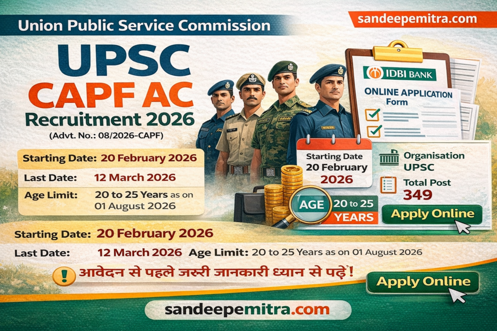 UPSC CAPF AC Recruitment 2026,UPSC ne Combined Central Armed Police Force (CAPF) ke padon par recruitment ke liye official website par notification release kar diya hai. Yeh recruitment total 349 posts ke liye nikali gayi hai. Is bharti ke liye online application form 20 February 2026 se start ho chuka hai aur candidates 12 March 2026 tak apply kar sakte hain. Is recruitment ke liye minimum age 20 years aur maximum age 25 years rakhi gayi hai, jo 01 August 2026 ke according count ki jayegi. Jo candidates is bharti ke liye apply karna chahte hain, unhe UPSC CAPF AC Recruitment 2026 se judi sabhi important details niche di gayi information me dhyan se check kar leni chahiye. (Advt. No.: 08/2026-CAPF).
